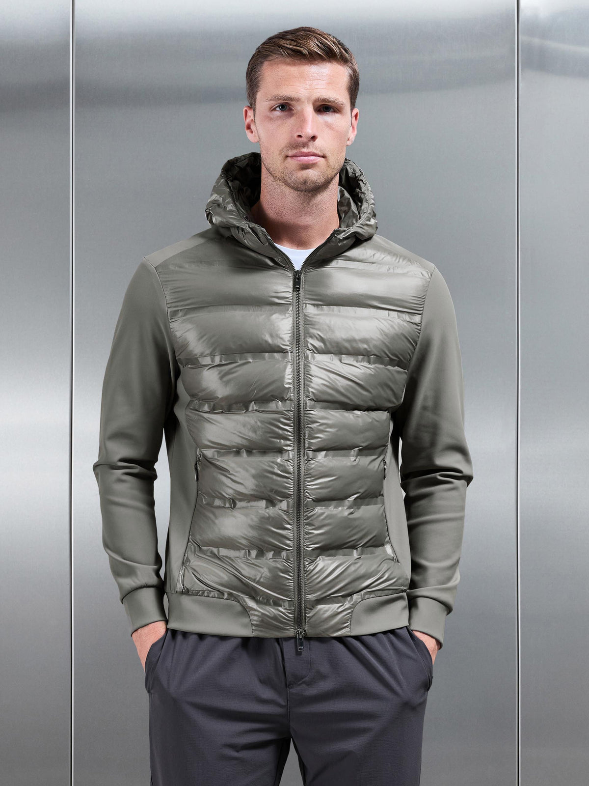 High shine woven fabrication to the front body and hood, lightly padded for comfort and insulation
