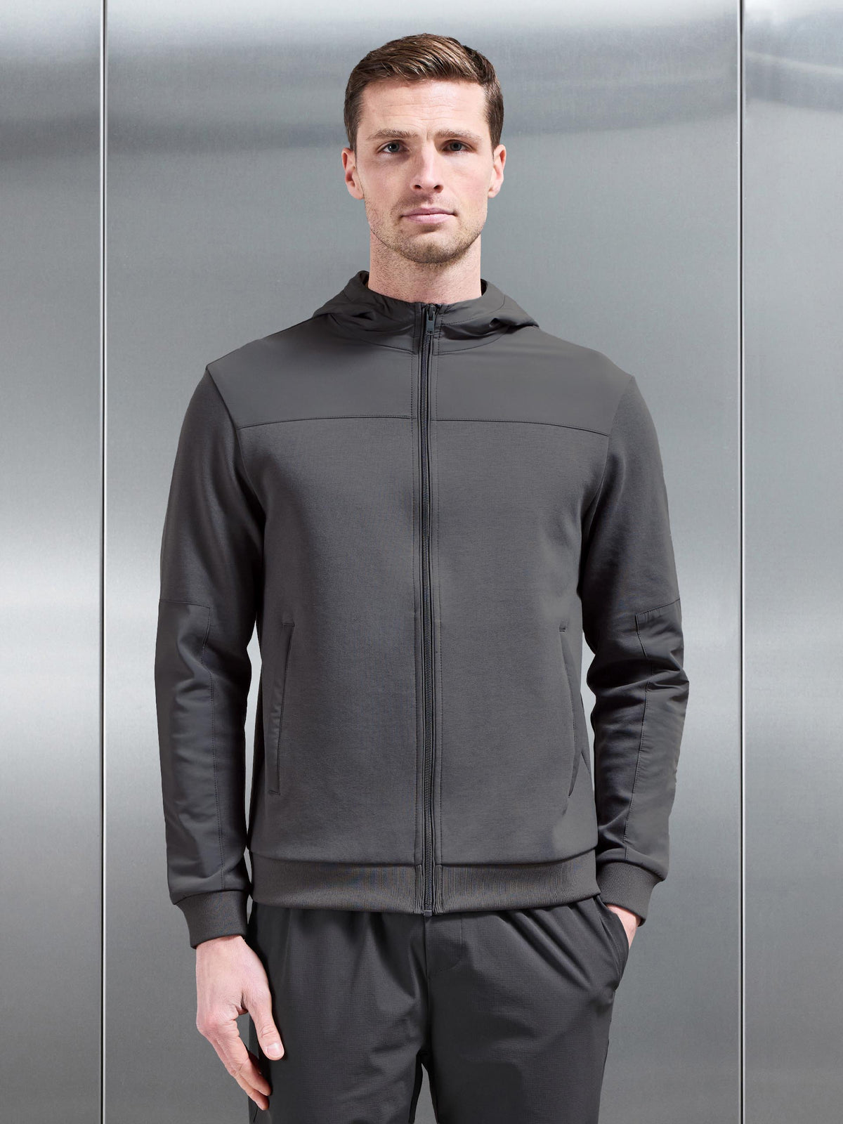 Slim fit jacket windbreaker with 3 panel adjustable hood to neckline