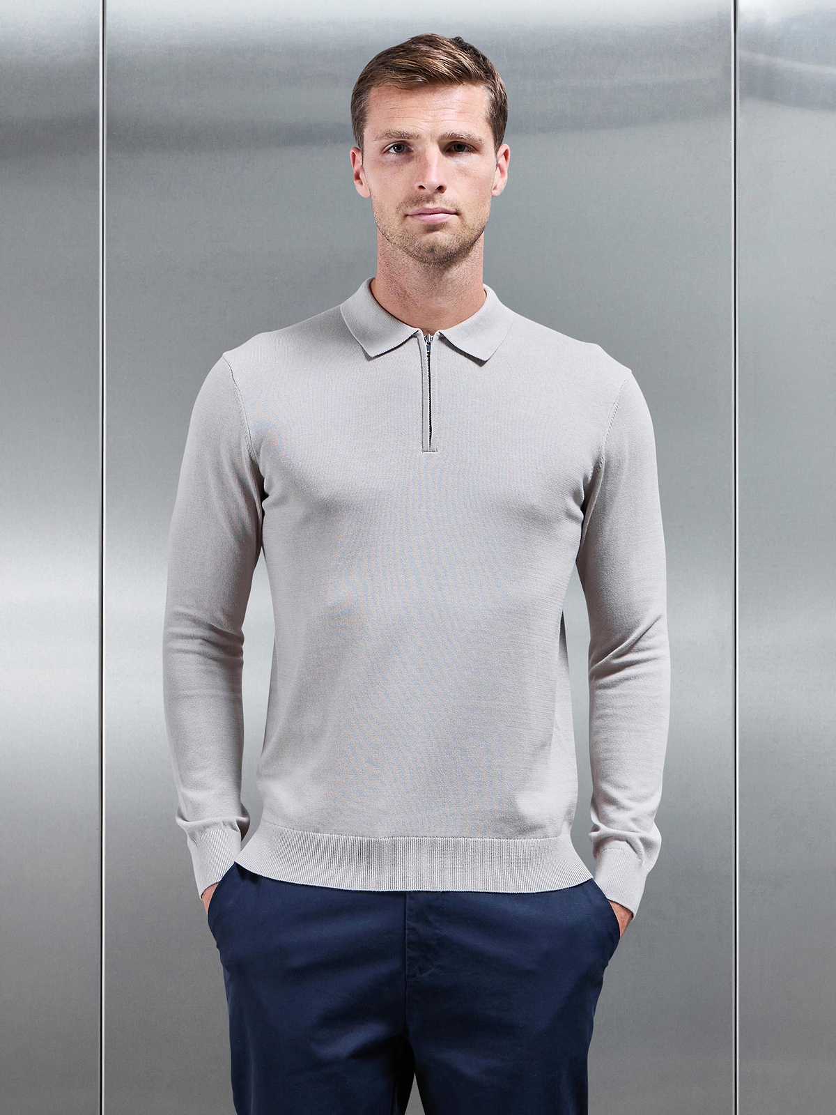 Cotton Knitted Long Sleeve Half Zip Polo Shirt in Stone