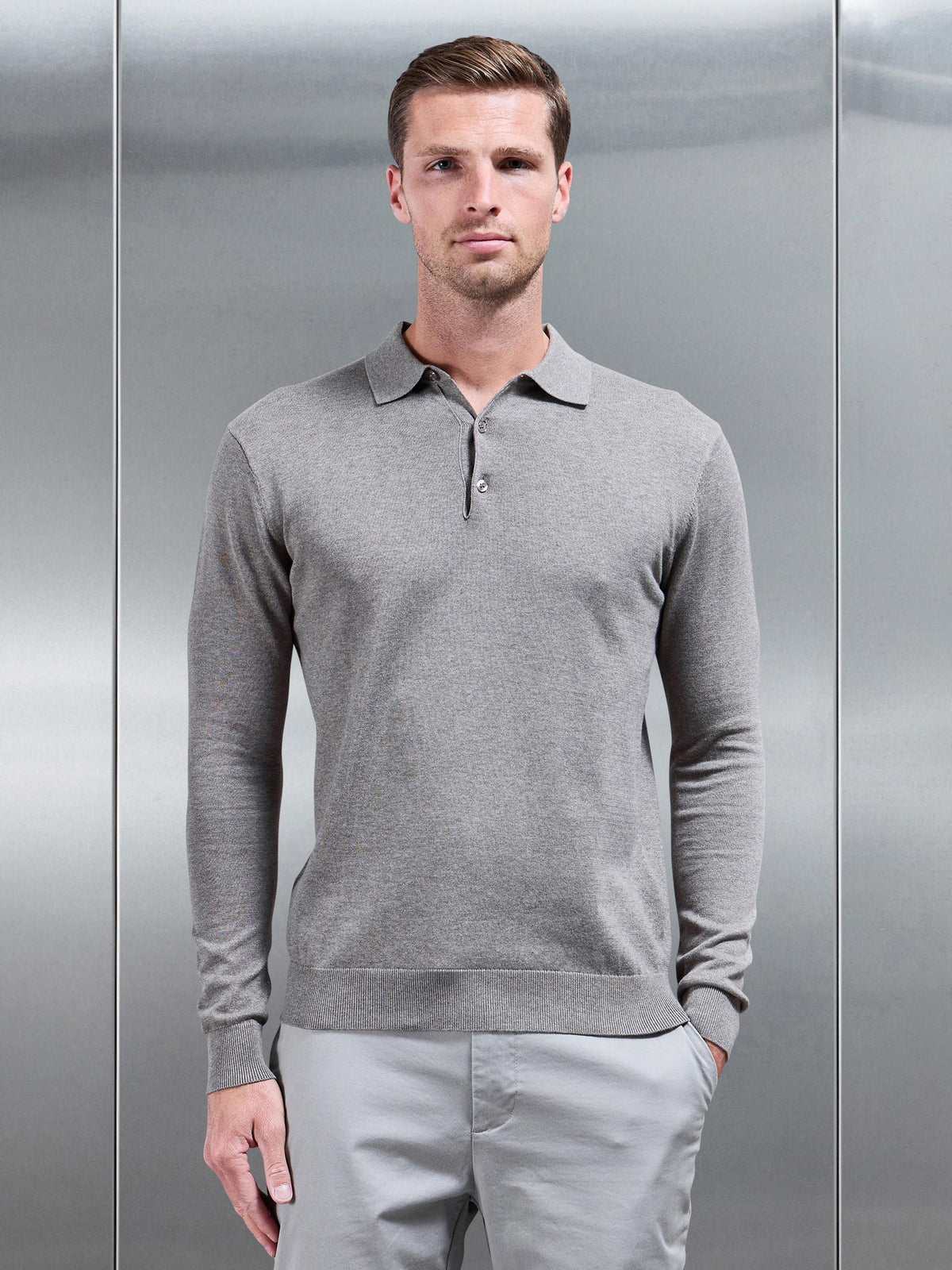 Cotton Knitted Long Sleeve Button Polo Shirt in Taupe Marl