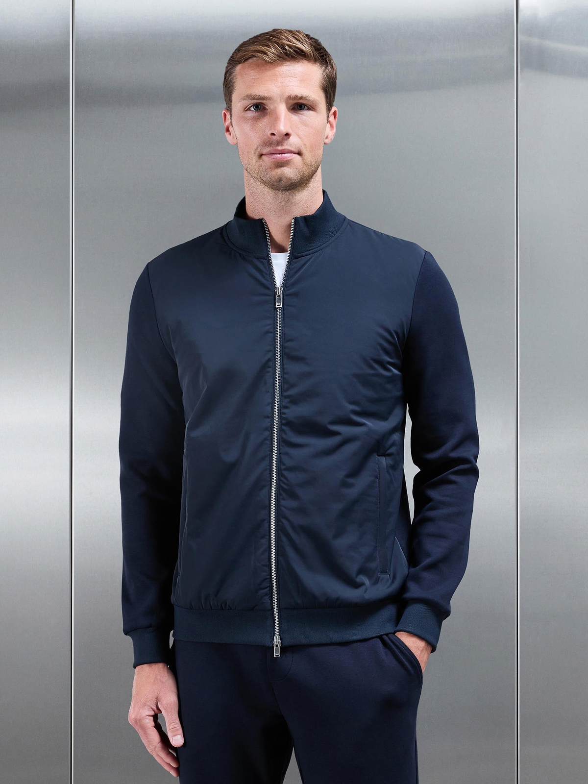 Interlock Jersey Hybrid Funnel Neck Jacket in Navy